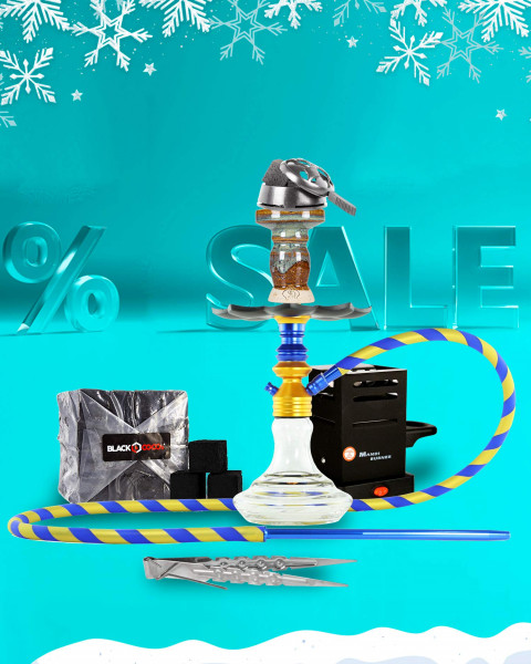 Pack exclusivo de la cachimba Harmony Hookah, en color azul y dorado, con varios accesorios, ¡todo lo que necesitas para disfrutar de ella!